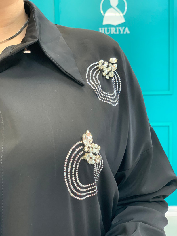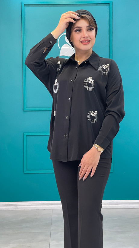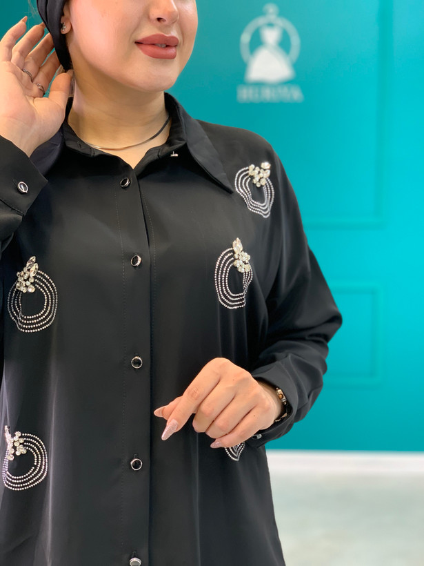شومیز مشکی مجلسی سنگدوزی شده بخاطر برش حلقه آستین ها که افتاده هست قواره کار رو آزاد میکنه و هر سایز چندتا سایز ساپورت میکنه جنس پارچه شومیز خیلی سبک و لخت و ریزشداره و کاملا مشکی